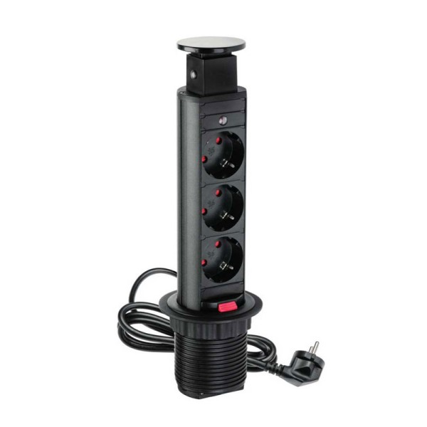 Цилиндрический встраиваемый удлинитель GTV имеет три розетки. Он предназначен для установки непосредственно в столешницу офисной и кухонной мебели. Возможность выдвижения при необходимости позволяет сэкономить место на столешнице.