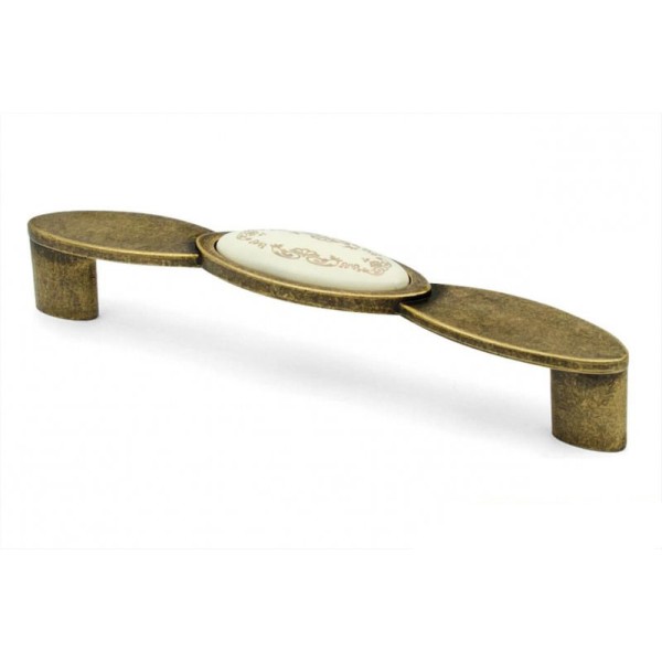 Ручка скоба Virno Azure MLC A3 бронза 101/128 - это стильная и элегантная накладная ручка, которая идеально подойдет для обновления интерьера вашего дома или офиса. Она выполнена в ретро стиле с изысканной провансальской отделкой и керамической вставкой с золотистым узором по краю.