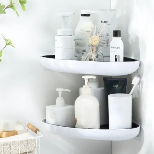 Кутова полиця для ванної кімнати MVM - сучасне та стильне вирішення проблеми безладу у ванній або на кухні. Це гарний пластиковий органайзер на клейкій основі, не вимагає свердління стіни, просто встановлюється та легко знімається. Кутова полиця для ванної та кухні відмінно тримається на водостійкій клейкій основі. Витримує навантаження до 5 кг. Застосування кутової полиці: - у кут душової кабіни - у ванній біля дзеркала або над пральною машинкою; - у кут на кухні; - у передпокої (за наявності гладкого непористого покриття стіни). В органайзері легко поміститься шампунь, кондиціонер, гель для душу та інші дрібниці. Встановивши кутову полицю на кухні, можна зберігати різні кухонні дрібниці та інструменти. Продукт виготовлений із удароміцного АВЅ пластику, який може бути повторно перероблений.