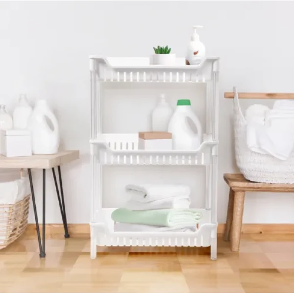 Етажерка для ванної кімнати, яка ідеально підходить для зберігання банок та пляшок. Також може використовуватися на кухні або у коморі. Особливість етажерки - зручна конструкція з трьох полиць з бортиками, яку легко збирати та розбирати. Крім застосування у ванній кімнаті, етажерку можна використовувати для зберігання продуктів, банок з соліннями, спецій, господарських товарів або пральних приладдя, іграшок у дитячій кімнаті або дрібниць на балконі або інструментів у гаражі. Допустиме навантаження до 10 кг. Аксесуар виготовлений з високоякісного поліпропілену та полістиролу, який відрізняється міцністю та стійкістю до впливу зовнішніх факторів. Етажерка підходить для домашнього та громадського користування при температурі від -5°С до +50°С