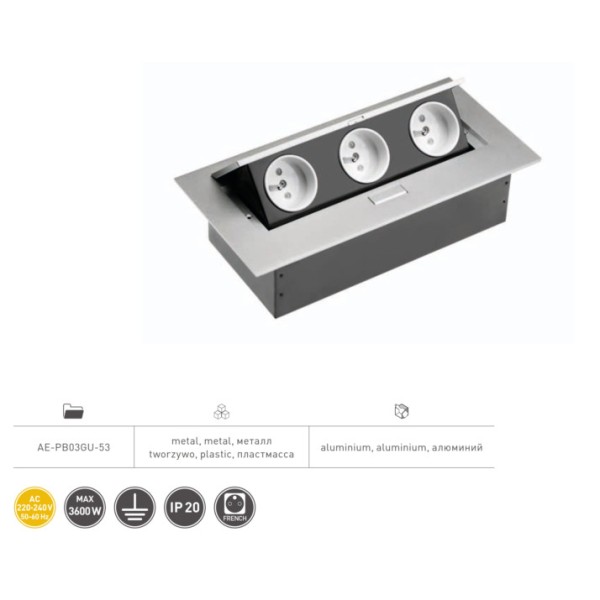 Вбудована меблева розетка GTV - це функціональне рішення, яке непомітно і естетично приховає надлишки кабелів, що стирчать. Вона обладнана двома мережевими розетками French , одним входом USB, двома входами/виходами MiniJack та входом Інтернет RJ45 Ethernet. Подовжувач з успіхом можна використовувати на кухні, на робочому столі та на стільниці. Особливості втопленої розетки GTV: модель AE-PB02GU-53 настільна розетка він має роз'єм USB, 2 роз'єми MiniJack 4 мм та вхід RJ45 максимальне навантаження всіх розеток 3600Вт 1-й ступінь захисту Тип розетки: French колір корпусу: алюміній матеріал: пластик + метал ..