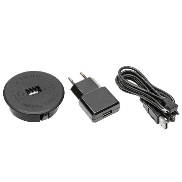 Бездротовий зарядний пристрій із блоком живлення Потужність: 0,5 (Вт) Матеріал: пластмаса Максимальне навантаження гнізда USB [A]: 2,1 Колір чорний Живлення напругою [В, Гц]: 5, DC Максимальна сила бездротової зарядки [A]: 1