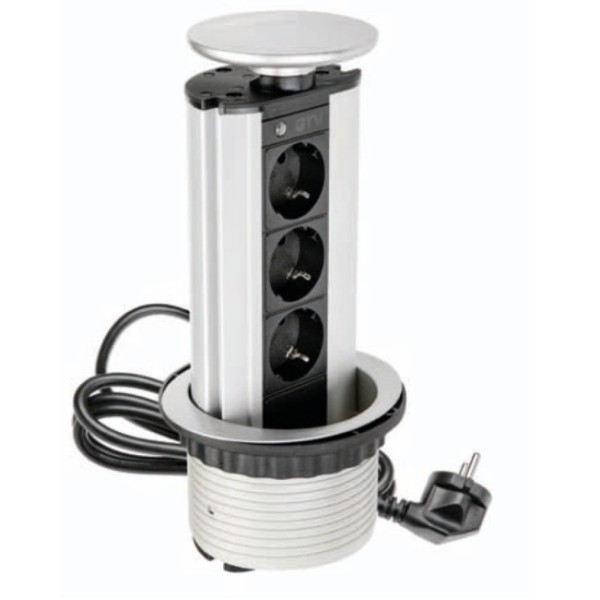 Вбудована настільна розетка GTV має одну французьку розетку та дві USB-розетки. Розетка має діаметр 100 мм і встановлюється в отвір столах або стільницях. Верхня частина гнізда має кришку, яка може бути закрита, коли вона не використовується. Особливості настільного подовжувача: 1 французька розетка 2 роз'єми USB 5V/2A 220-240 В змінного струму довжина кабелю 1,5 метра кабель з вилкою діаметр 100 мм навантаження до 3600 Вт закрита захисна кришка колір: сріблястий..