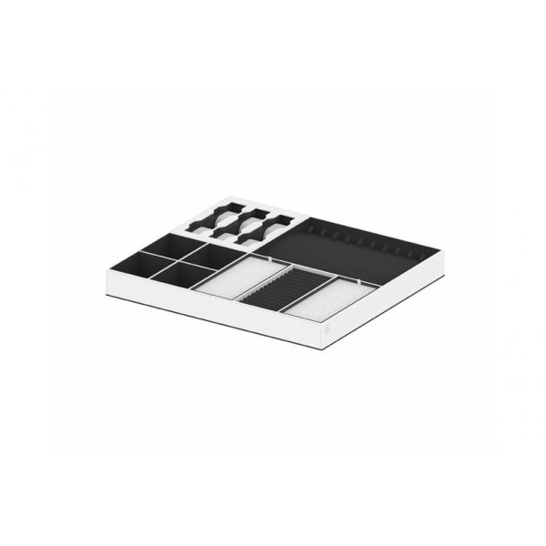 Приклади комбінацій органайзерів для гардеробу, залежно від ширини ящика, вказані на фотографіях товару. Наприклад, для висувної полиці для органайзера MAXIMA PURO шириною 600 мм ви можете вибрати одну з таких комбінацій: