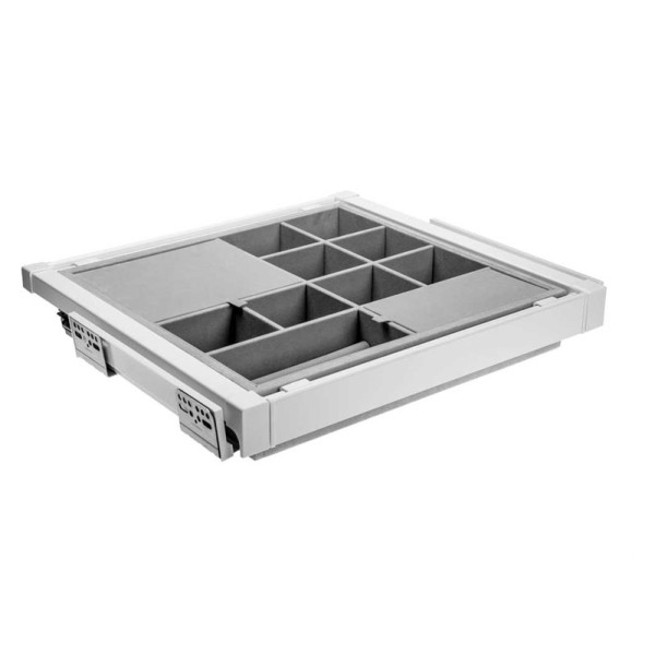 Висувний ящик із органайзером із серії ELITE від GTV дозволяє організувати дрібні аксесуари. Речові відсіки, відсіки та ролики дозволять організувати прикраси, годинники, мушки чи інші дрібні аксесуари. Напрямні, приховані у рамі, мають функцію безшумного закривання. Ширина скриньки регулюється до 60 мм. Пропозиція білого кольору.