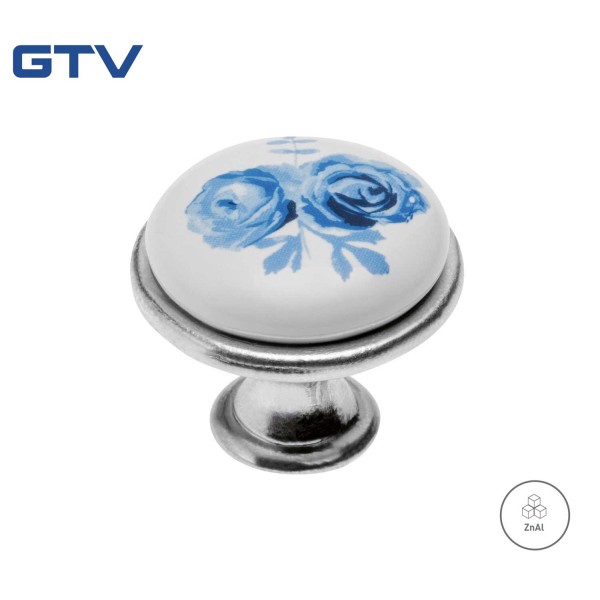Вишукана ручка-кнопка GTV, модель 728-P, прикрашена керамічною вставкою із зображенням блакитної квітки, є ідеальним вибором для надання ваших меблів елегантності та стилю. Виготовлена з високоякісного сплаву цинку та алюмінію (ZnAl), ця ручка не тільки має міцність і довговічність, але й привносить в інтер'єр нотку античної вишуканості завдяки своєму кольору "Античне срібло". Керамічна вставка з ніжним зображенням блакитних кольорів додає виробу витонченого та свіжого вигляду.