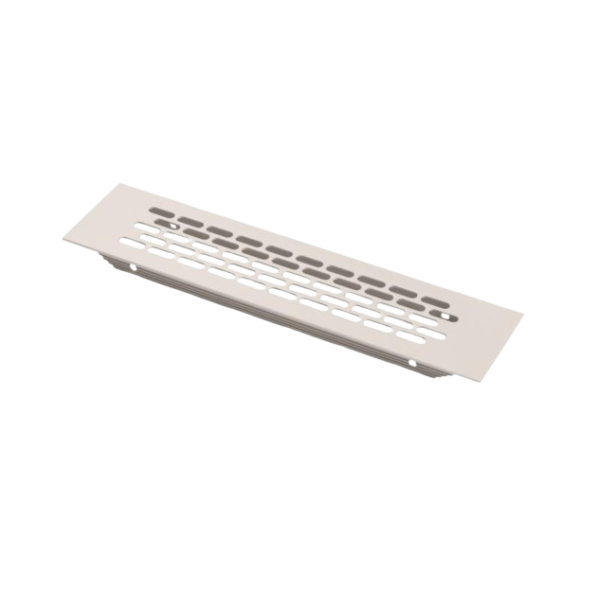 Решітка виконана з алюмінію із зносостійким покриттям кольору «кашемір». Прямокутні прорізи забезпечують достатній переріз для повітря, а низький профіль рамки акуратно перекриває край вирізу. Конструкція розрахована на врізний монтаж у підготовлений отвір та підходить для застосування в кухнях, гардеробних та меблевих конструкціях іншого призначення.