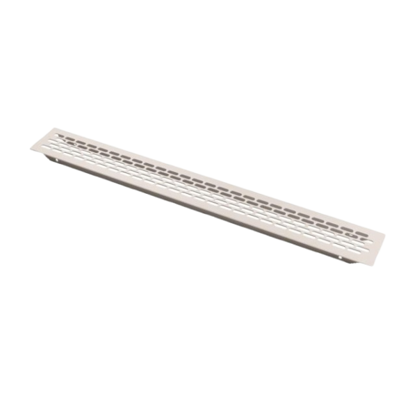 Решітка виконана з алюмінію з міцним покриттям кольору «кашемір». Поздовжні отвори забезпечують вільну циркуляцію повітря, а рамка з невисоким профілем акуратно перекриває край вирізу. Конструкція розрахована на монтаж у врізний отвір і підходить для використання як в кухонних, так і в корпусних меблях.