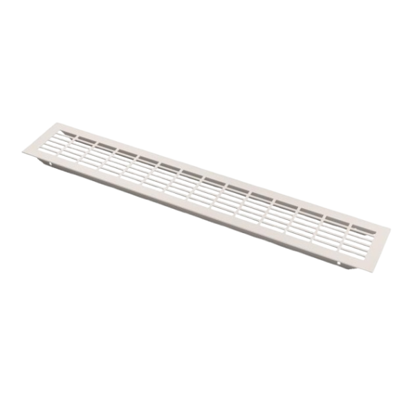 Зовнішній розмір решітки становить 480×80 мм, рекомендований виріз під монтаж – приблизно 455×65 мм. Невелика висота рамки дозволяє встановлювати її в стільниці, цоколі та фасади без помітного виступу. Покриття кольору кашемір гармонійно поєднується зі світлими і пастельними кухонними гарнітурами, зберігаючи акуратний зовнішній вигляд меблів.
