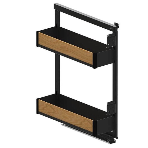 Карго кошик REJS з лінії Maxima PURO - це рішення, що дозволяє максимально використовувати вузький простір на кухні. Призначений для шаф із зовнішньою шириною 200 мм. Кошик висувається по напрямних повного висунення з функцією безшумного закривання. Двоярусний кошик вражає своєю естетикою – чорний, матовий колір із декоративними боковинами кольору дуба – дуже стильне поєднання. Висота корзин може вільно регулюватися.