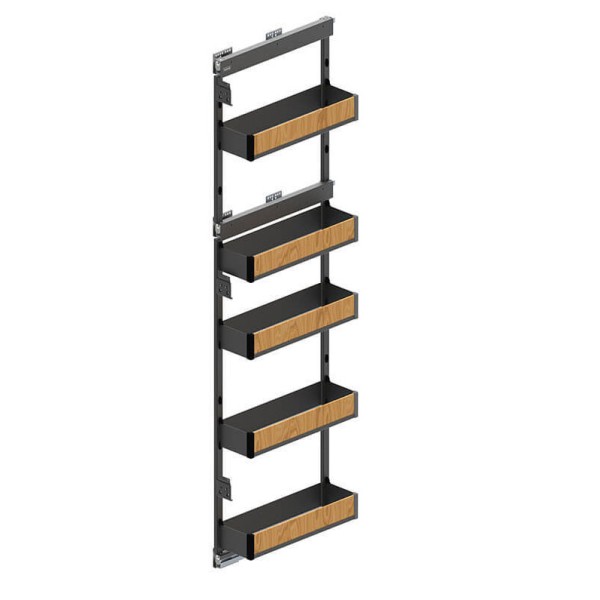 Особливості вантажного кошика максі: символ: WE35.0022.12.C74 лінія: Максима Пуро для шафи із зовнішньою шириною 150 мм версія з бічним кріпленням (з лівого боку кузова) має п'ять сталевих кошиків чорного кольору (мат) висоту кошиків можна регулювати у комплект входять п'ять декорів кольору дуба кошики з повним дном, вкриті протиковзким килимком мінімальна висота кузова: 1700 мм на напрямних повного висування напрямні з функцією плавного закривання максимальне навантаження: 100 кг колір: чорний / дуб