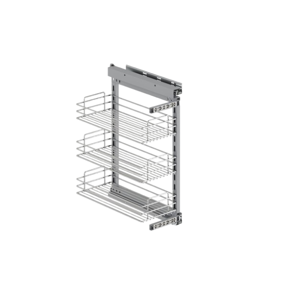 REJS WE32.0010.43.781 MAXIMA SILVA Cargo MAXI сторона 150 правий метал / МДФ хром / графіт 5 рівнів ОСОБЛИВОСТІ ПРОДУКТУ: * Кошики з хромованого дроту (у комплекті 5 шт.) * Допустиме навантаження 20 кг * Напрямна система з м'яким закриттям * Можливість встановлення електроприводу системи відкривання сервоприводу. * Ексцентрикове переднє регулювання у трьох вимірах * Регулювання висоти корзин збільшує гнучкість використання продукту..