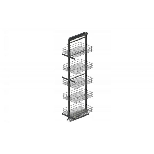 Професійна система зберігання REJS Maxima Classic на 5 полицях призначена для високих кухонних шаф із внутрішньою висотою 1700–1900 мм. Карго виготовлене з міцного металу з порошковим покриттям у кольорі антрацит (графіт), що забезпечує довговічність, естетику та стійкість до подряпин. Сталевий каркас і п'ять просторих дротяних кошиків здатні витримувати навантаження до 100 кг на весь комплект.Конструкція дозволяє індивідуальне налаштування висоти монтажу кошиків і полиць, можливе встановлення перегородок або додаткових аксесуарів для організації простору. Сумісність з електросистемами відкривання, такими як Blum Servo Drive, робить це рішення ще зручнішим. Направляючі в комплект не входять — їх потрібно придбати окремо відповідно до типу установки.
