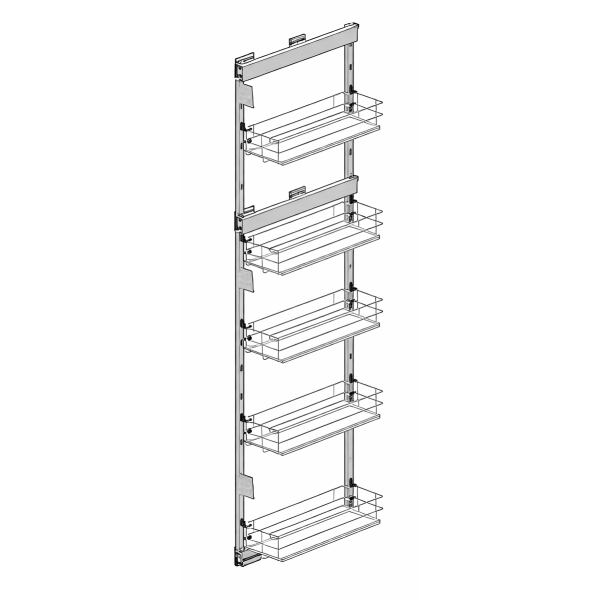 особливості: - бічний вантажний, - лівий варіант кошика, - кількість рівнів: 5, - розроблений для шафи із зовнішньою шириною 15 см, - напрямна з повним висуванням та висуванням, - кошики: хром/білий, - рамка: сіра.