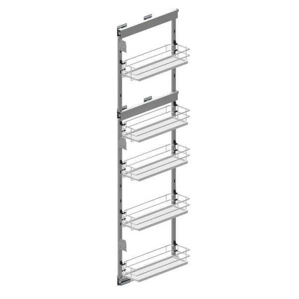 особливості: - бічний вантажний, - лівий варіант кошика, - кількість рівнів: 5, - розроблений для шафи із зовнішньою шириною 20 см, - напрямна з повним висуванням та висуванням, - кошики: хром/білий, - рамка: сіра.