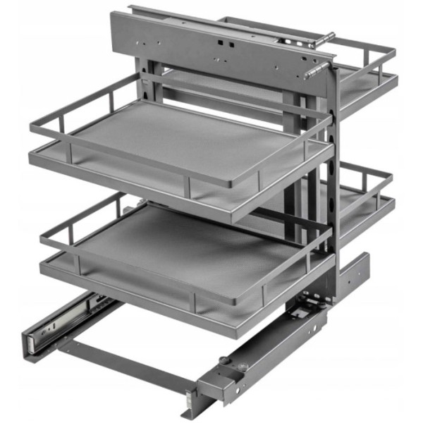 Кутовий кошик GTV MOVIXPRO - це виріб, який дозволить вам функціонально облаштувати кутову кухонну шафу. Кошик може бути встановлений у шафах з лівим або правим переднім відкриванням. Перші полиці мають вантажопідйомність до 5 кг (кожна), наступні дві по 7 кг. Кошик поміститься у шафі з хв. зовнішня ширина 900 мм передня ширина 450 мм.