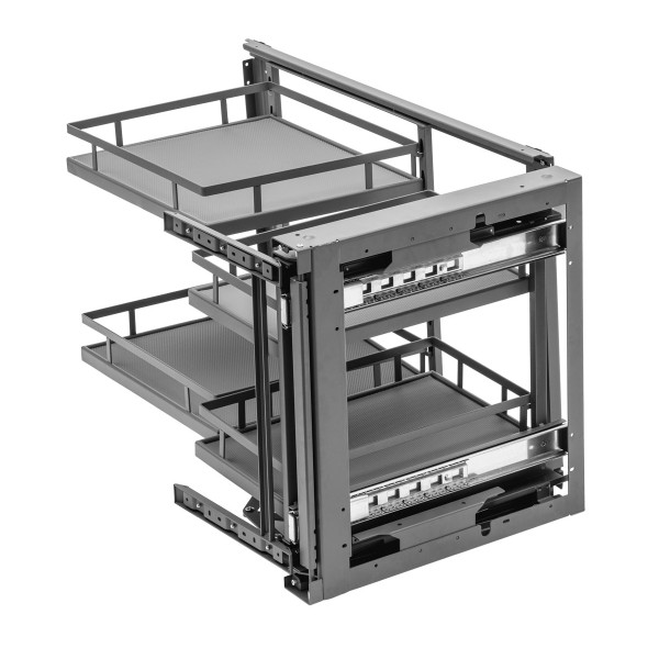Кутова система зберігання для кухні GTV MOVIX PRO полегшить оптимальне керування кутовими кухонними шафами. Це дасть вільний доступ до продуктів, що зберігаються на ньому. Усі чотири полиці можна висунути за межі шафи. У цьому кошику використовуються напрямні повного висунення із вбудованою системою плавного закривання. Карго можна встановити як у шафу, розташовану з лівого, так і з правого боку кухонного гарнітура.