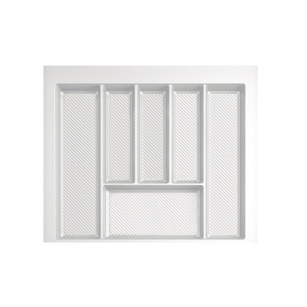 Лоток для столових приладів REJS MAX білий призначений для кухонних ящиків шириною 600 мм. Фактичний розмір лотка складає 550×490 мм, з можливістю підрізування по ширині до 490 мм та по глибині до 420 мм. Виконаний із міцного пластику товщиною 2 мм, стійкого до вологи та механічних пошкоджень. Оптимально організує простір усередині ящика, забезпечуючи зручне зберігання столових приладів.