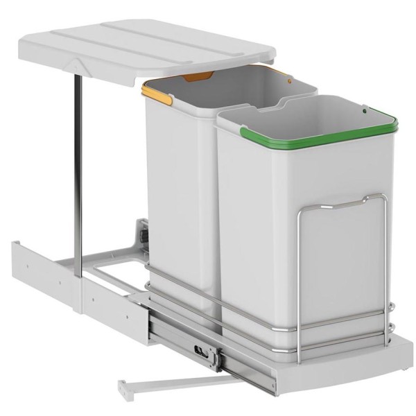 Компактне рішення для організації системи поділу відходів у кухонних меблях. Відро складається з двох контейнерів по 12 літрів кожен, що дозволяє зручно сортувати сміття. Конструкція обладнана висувною системою на телескопічних напрямних для легкого та плавного відкривання.